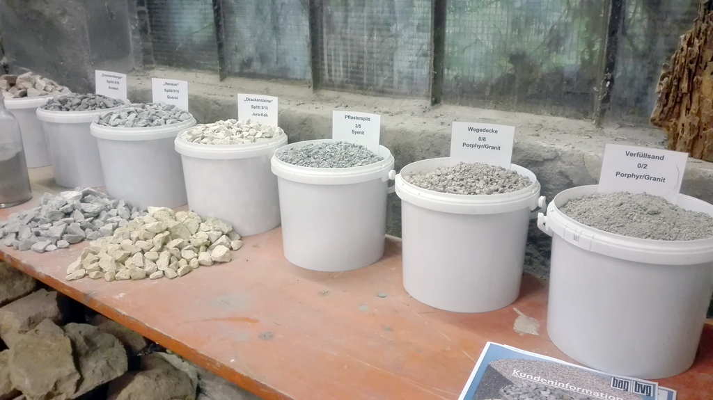 Beton ist das aktuelle Haupt-Standbein der PWS, ferner Schotter - aus dem Aushub wurde am Hockenheimring und im Gleisbett der OEG verarbeitet. Verschiedene Körnungen werden nur gehandelt, nicht hier erzeugt: Privatleute oder Gartenbaufirmen brauchen meist zu kleine Mengen um sie vior Ort zu erzeugen. Auch Lieferung an Baumärkte wäre zu teuer. Eigenprodukt ist die 08er Körnung für wassergebundenen Wegebau, für die es eine größere Abnahme gibt.