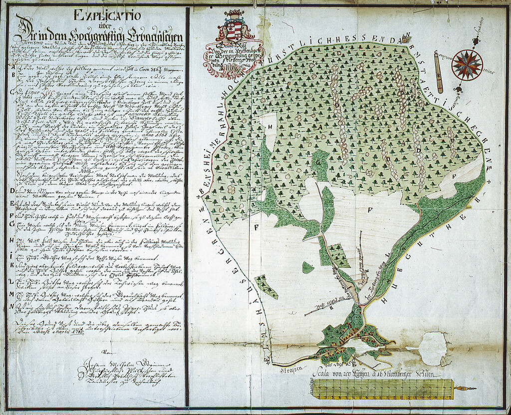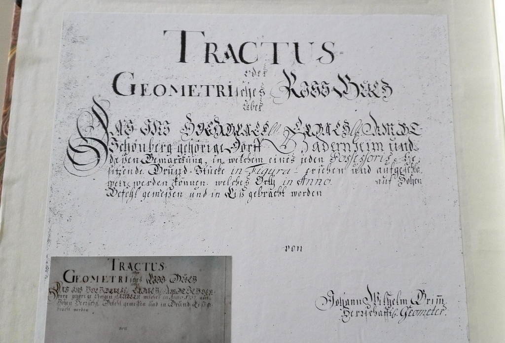 Ab 1719 erfaßte man im hochgräflich Erbachischen Amt Schönberg Wald, Wiesen, Äcker und Gärten „auf geometrische Art nach der Dreiecksmethode“ (Rößling S. 287). Im Auftrag der Fürstenauischen Regierung entwarf Geometer Johann Wilhelm Grimm (1703-1778) 1749 ein ausführliches Vermessungskonzept als Richtlinie für geometrische Kartierungen.