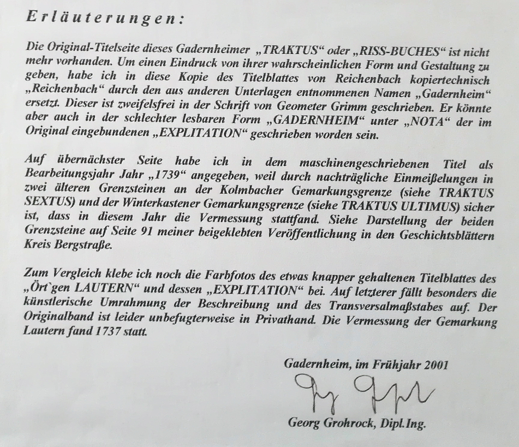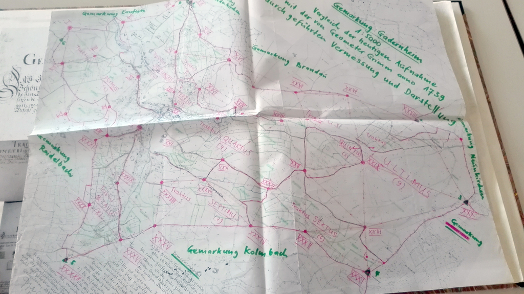 Anmerkungen von Georg Grohrock: links handschriftliche Eintragungen "Vergleich der heutigen Aufnahme mit der von Geometer Grimm anno 1739 durchgeführten Vermessung und Darstellung", rechts Übertragung