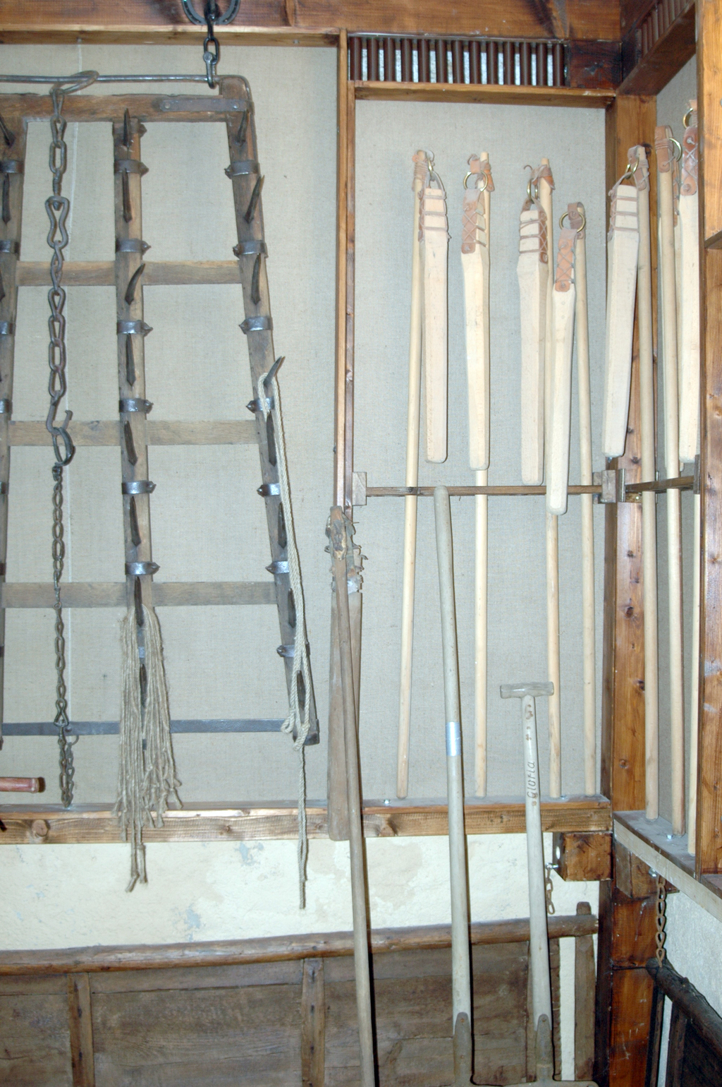 Dreschflegel, in früheren Zeiten in der Landwirtschaft unbedingt erforderlich... Mehlsack-Ausklopfmaschine