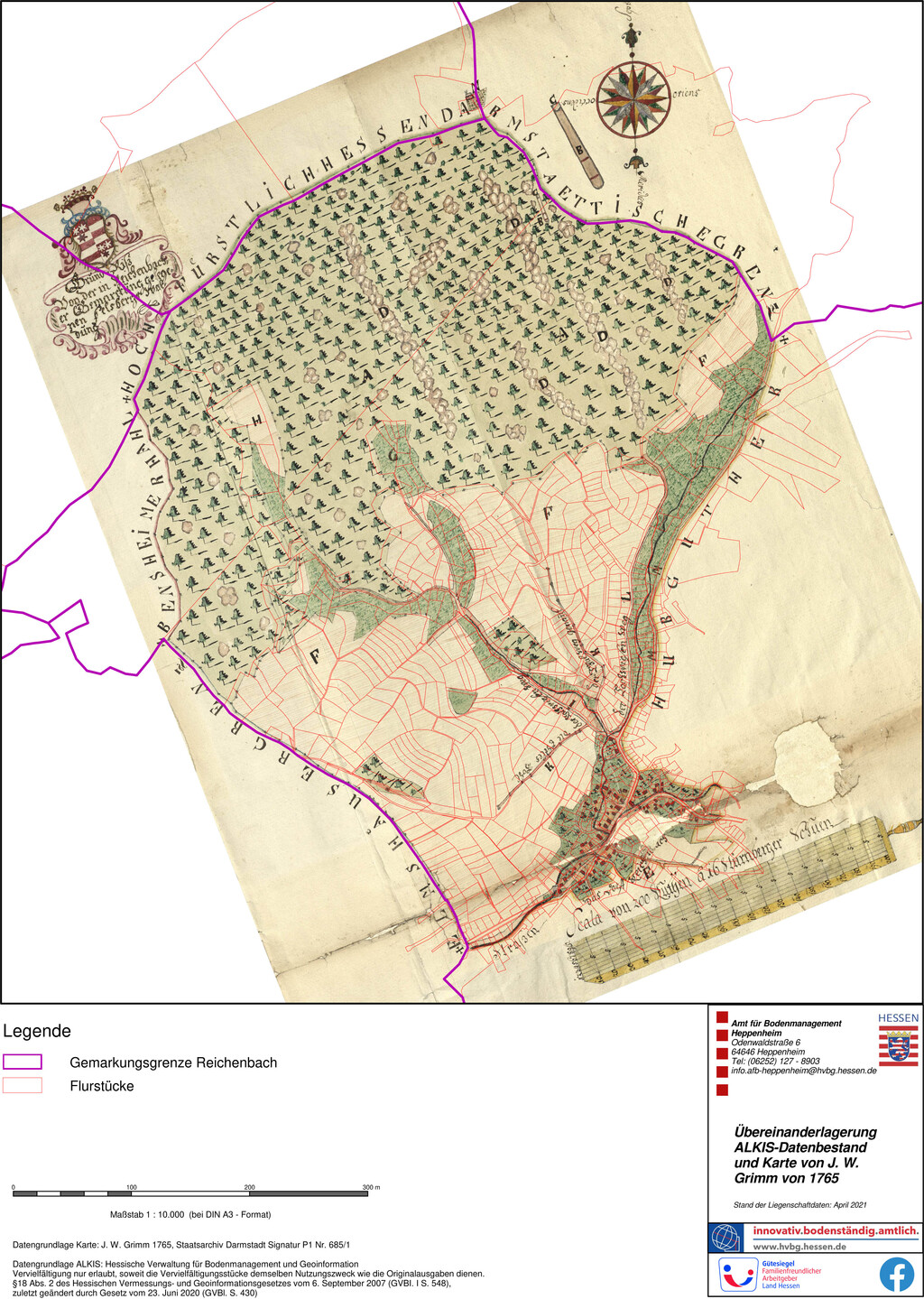 Wie wichtig Grimms Arbeiten für künftige Besitzklärung und Besteuerung wurde, wird in meinem Aufsatz „Beginn der geometrischen Kartografie im Odenwald“ erläutert: In diesem Aufsatz wird versucht zu ermessen, wieviel Mühe und Sorgfalt Geometer Grimm einst aufwenden mußte, um eine saubere Legende zu seinen akkurat gezeichneten Karten zu schreiben, und wie oft er wohl alles abschreiben mußte bis es seinen Ansprüchen genügte. Auch wie schwierig es war, geeignetes Papier in passendem Format zu bekommen, muß bedacht werden, um Grimms Jahrhundertwerk beurteilen zu können, das bis in die heutige Zeit gültig ist. Eine spätere Neuvermessung wurde in Reichenbach nicht erforderlich, die Grenzen sind anhand der topografischen Karte sehr gut mit Grimms Karte zu vergleichen.