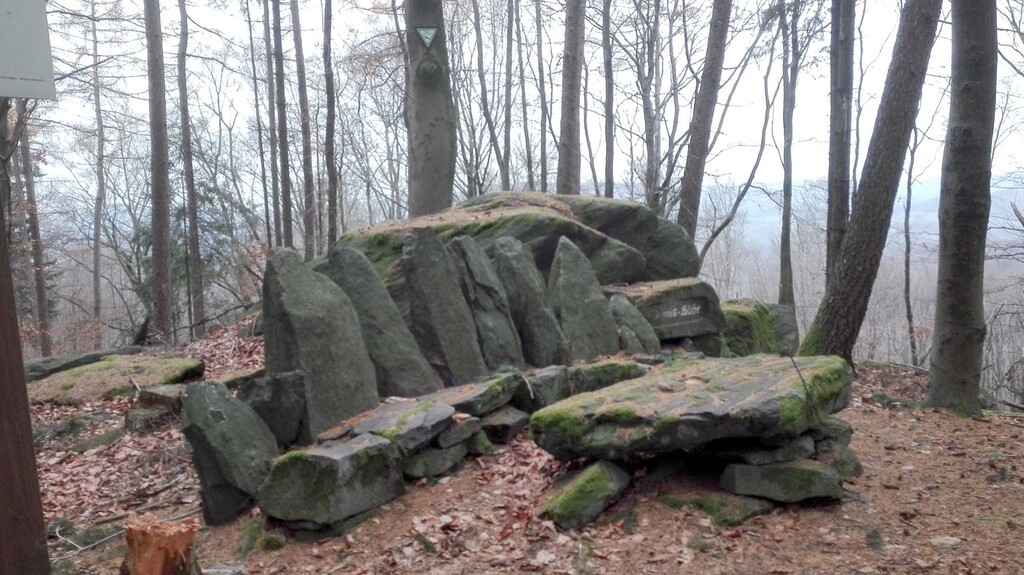 Jennis Höhe: völlig unvermutet stößt man etwas abseits an der Einfahrt zu einem Forstweg oberhalb Breitenwiesen auf eine natürliche Felsgruppe mit Inschrift. Eine Infotafel des Geopark besagt dazu:
