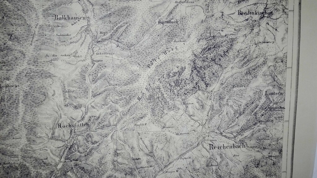 In meinem Treppenhaus hängt eine ganze Sammlung mit Repros historischer Karten der Region. Eine davon ist das Blatt Bergstrasse, aufgenommen in das trigonometrische Netz der allgemeinen Landesvermessung aus der Litho-Anstalt Welzbacher. Maßstab 1:25.000. Hier ein Ausschnitt: