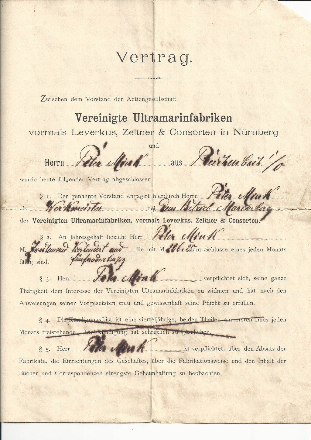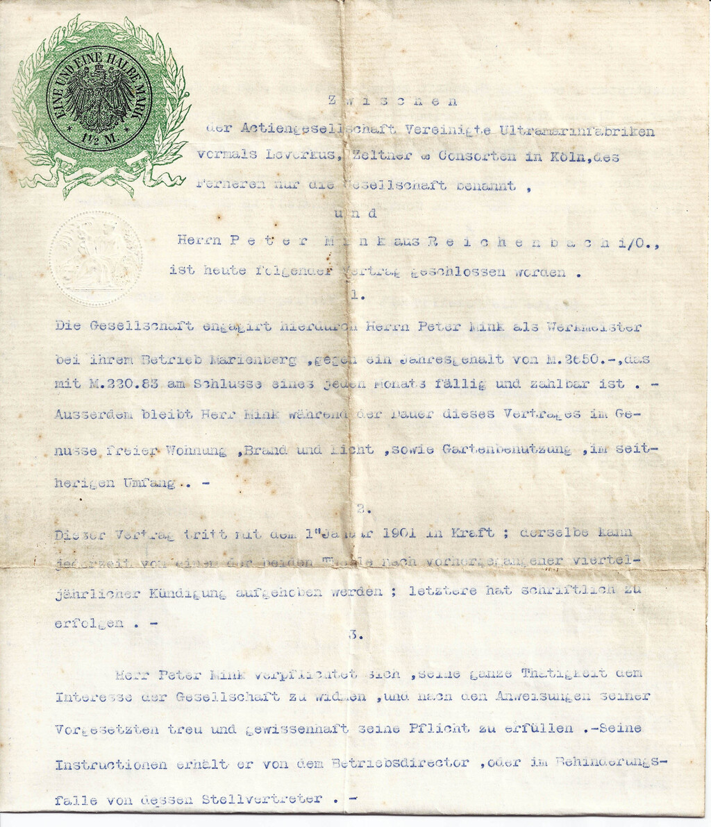 Ein Arbeitsvertrag aus dem Jahr 1895: Werkmeister Peter Mink aus Reichenbach