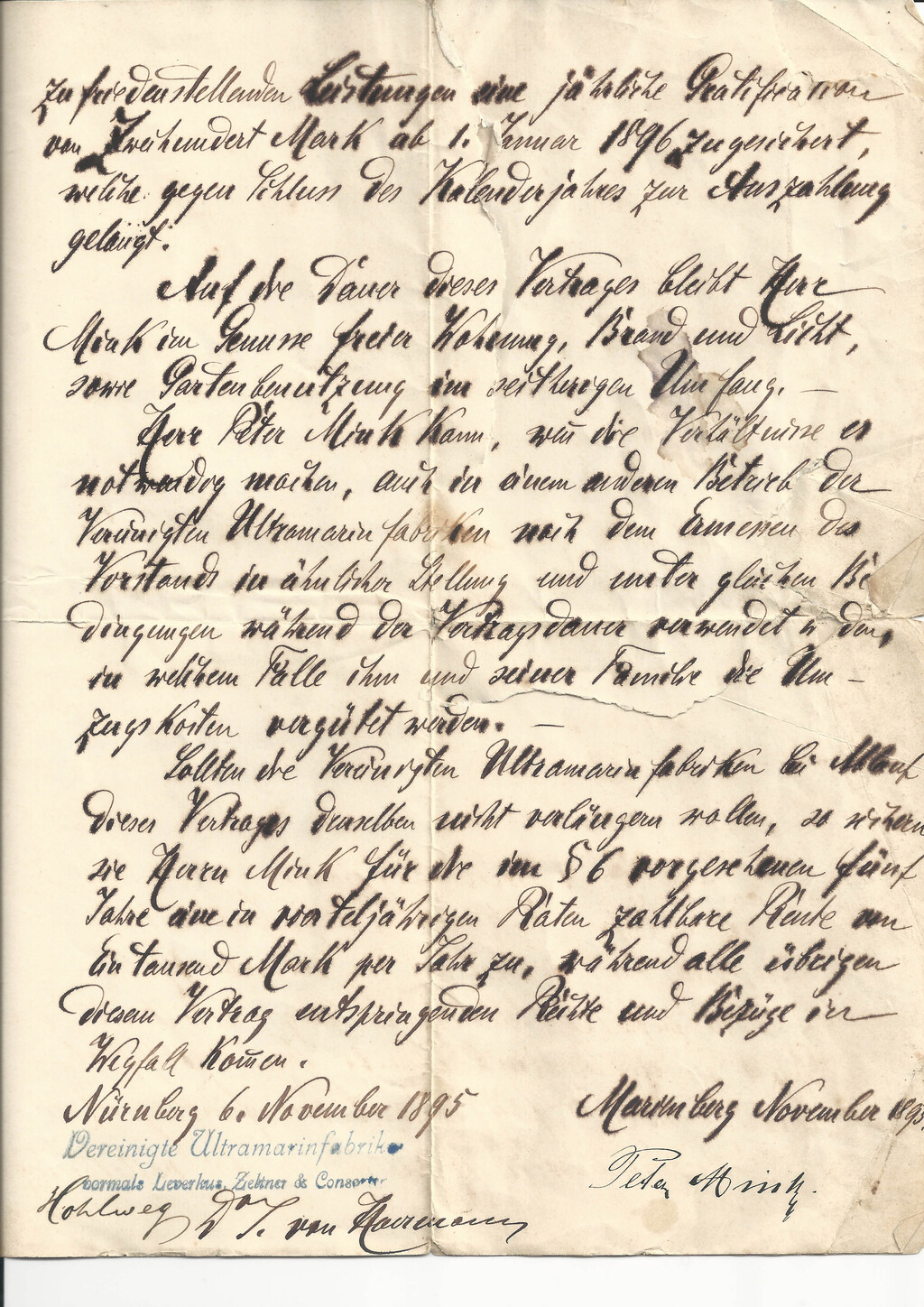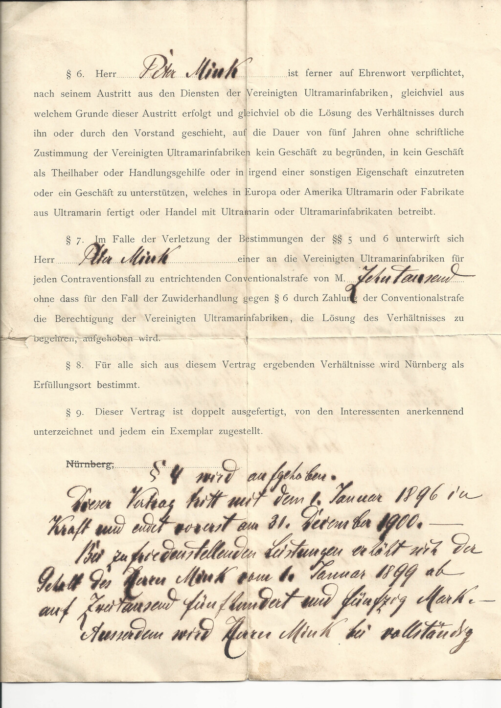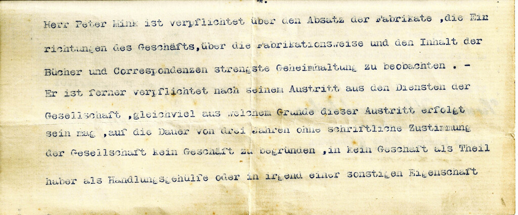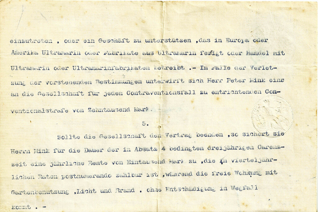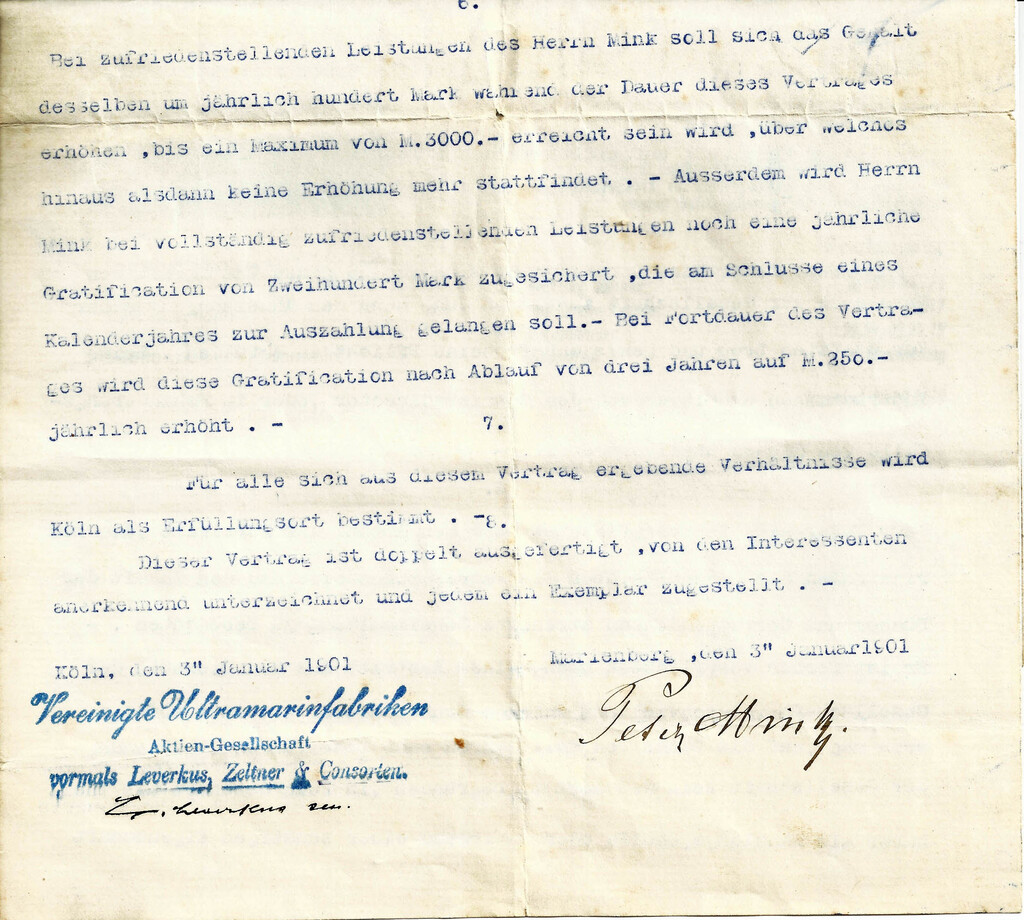 Mink mußte sich auf Ehrenwort verpflichten, nach Ausscheiden aus der Firma fünf Jahre lang kein Ultramaringeschäft zu gründen oder als Teilhaber einzusteigen. Bei Verletzung wurde eine Conventionalstrafe von 10.000 Mark fällig. Der Vertrag war zunächst auf vier Jahre befristet und beinhaltete freie Wohnung, Brand, Licht und Gartenbenutzung.