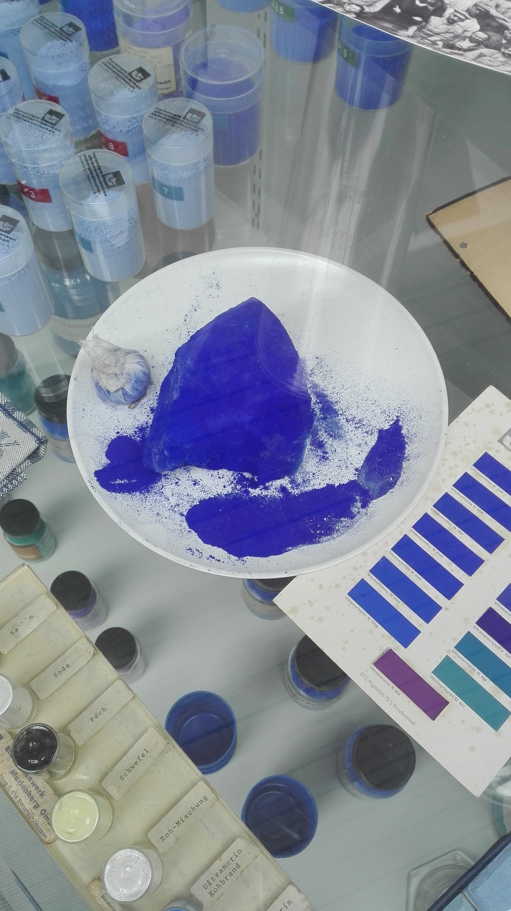 Die Farben wurden in Tiegeln gebrannt. Diese faßten je 10 Liter und wurden aus Schamottegranulat oder Kapselscherben mit Tiegelton und Wasser im Kollergang gemischt, in einer Strangpresse entlüftet und portioniert. Die Tiegelpresse formte dann aus den Batzen Tiegel. So konnten pro Tag bis zu 350 Tiegel und150 Deckel hergestellt werden, die dann drei Tage trocknen mußten, bevor sie gebrannt wurden. Ein Tiegel wog dann ca. 8,5 kg. Er wurde mit 12,5-14 kg Rohmischung befüllt und mit 1200 Kollegen in den Kammerofen eingesetzt. Um Deckel zu sparen, setzte man die Tiegel Öffnung auf Öffnung (die zweite Reihe kopfunter) auf. 6-7 Tiegel pro Säule waren möglich. Die Kammeröfen konnten so jeweils 11-16 Tonnen Ausgangsmischung brennen. Pro Monat wurden 46 Durchläufe gebrannt, ein komplizierter Vorgang mit vielen Regelungs- und Überwachungsarbeiten. Insgesamt dauerte ein Brand 12-13 Tage, bevor der Ofen 2-3 Tage lang abkühlen mußte. Der Inhalt wurde dann herausgeklopft, es gab drei Qualitäten: 1. weiße Anteile = Abfall, 2. helles Blau = 2. Sorte, 3. kräftiges Blau = 1. Sorte und somit der gute Ultramarinblau-Rohbrand. Dieser wurde danach entsalzt und wiederum gemahlen, in zwei Kugelmühlen mit Quarzsteinchen als Mahlkies und Mahlflüssigkeit (Natronwasserglas) wurde der Rohbrand hier zu einer feinen Paste, die danach in der Flotation aufbereitet wurde. Abfallprodukt waren monatlich ca. 1,5-2,5 Tonnen Schwefelschlamm, der auf der Schutthalde gelagert wurde. Täglich konnten drei Chargen flottiert werden. Weiter ging es durch die Schlämmerei: in mehreren Kaskaden setzten sich die Körnchen in verschiedenen Stärken ab, die dann weiter zur Trocknerei wanderten. Die Brühe aus der Schlämmerei wurde ausgeflockt und getrocknet, das Wasser dekantiert. In der Trocknerei blieben die beladenen Horden 12-22 Stunden bei 150 Grad, das Ergebnis war Brockenblau, das dann in die blauen, heute als Regenwasserfässer beliebten 200-Liter-Fässer kam. 250-300 Fässer standen meist im Brockenlager, sorgsam beschriftet mit dem Farbton von dunkel bis hell, dem Reinheitsgrad von schmutzig bis höchste Brillanz und der Farbkraft von schwach bis stark. Das Farblabor ordnete jeweils Mustertütchen zum Verkaufsprogramm.