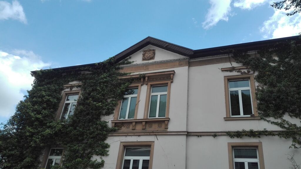Die gründerzeitliche Villa, die die von Ploennies einst errichtet hatten, dient heute als Wohn- und Geschäftshaus. Das Wappen, das den Giebel des Gebäudes ziert, war vor einigen Jahren einmal Gegenstand von Nachforschungen. Einer unserer Leser*innen hatte danach gefragt. Wir haben damals die Anfrage an die Hessische familiengeschichtliche Vereinigung geschickt, die ihrerseits beim Staatsarchiv Darmstadt nachhakte. Herr Rainer Maaß vom Staatsarchiv teilte uns dann folgendes mit: "das Wappen an der Villa Lautern ist wohl eher als Baudekoration zu verstehen, denn es stellt kein nach heraldischen Grundsätzen gestaltetes Wappen mit Schild, Helm und Helmzier dar. ... Es ist anzunehmen, daß dieses Wappen von einem der in der 2. Hälfte des 19. Jahrhunderts zahlreichen 'Wappenbüros' oder einem der kommerziellen 'heraldischen Institute' vermittelt wurde, die nicht nur neue Phantasiewappen entwarfen, sondern auch auf alte, tatsächlich vorhandene Wappen zurückgriffen. In diesem Fall handelt es sich ursprünglich um das auch in Siebmachers Wappenbuch registrierte Wappen der ungarischen Adelsfamilie von Volosinowszky. Es ist kaum anzunehmen, daß diese Adelsfamilie um 1850 Beziehungen zu Lautern hatte. Wenn das Gebäude aber nachweislich von einem Mitglied der Familie von Ploennies erbaut wurde (die ja ein ganz anderes Wappen führte), könnte es sich tatsächlich um ein Firmenwappen der Familie handeln, ... Vielleicht lassen sich die sich kreuzenden Pfeoile auch in anderem Zusammenhang mit dem Unternehmen Blaufarbenwerk nachweisen." Herr Dr. Maaß verwies noch auf ein Dokument im Staatsarchiv, das möglicherweise Näheres erbringen könnte.