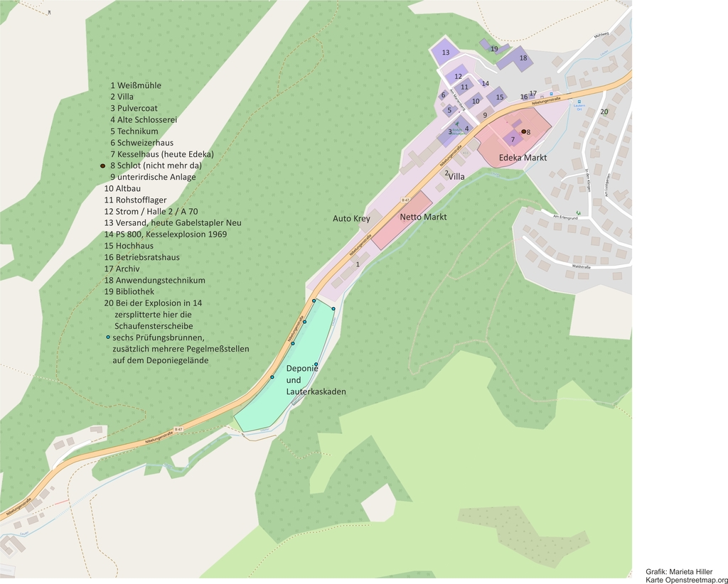 Ursprünglich floß das Abwasser der Blaufabrik auf der südlichen Straßenseite in drei Absetzbecken hinter dem Villagarten. Der Mühlgraben zur Weißmühle ist heute noch da. Die Weißmühle (später Flüchtlingsunterkunft von 2015 bis 2020) beherbergte das Kesselhaus mit Dampfmaschine und Kamin. Ein weiteres Ofenhaus mit Kamin lag auf der anderen Straßenseite (heute Auto Krey), und oberhalb lag ein drittes Ofenhaus mit Kamin. Darüber stand ein Gasometer, ein Holzschuppen sowie Warenmagazin und ein Wohnhaus. In der Villa residierte der Direktor sowie ein chemisches Laboratiorium, gegenüber lag eine weitere Wohnung und die Schlämmerei und Trocknerei, gefolgt von der Naßmühle und der Sieberei. Anschließend an die Villa folgten nach Osten die Remise für die Kutsche und die Stallungen (heute Fenster Steinmann) sowie etwas zurückgesetzt das Kesselhaus mit dem hohen Schlot auf dem Foto. Gegenüber der Villa lag die Schlosserei / Werkstatt (heute Fitness-Studio). Fünf Schornsteine prägten das enge Tal zwischen Reichenbach und Lautern.