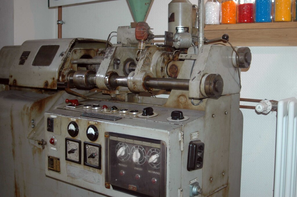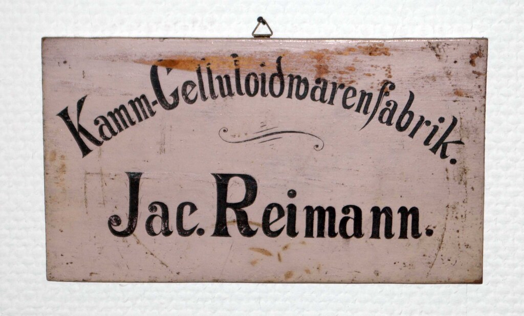 Die Anfänge im Spritzguß: eine Battenfeld-Anlage von 1960 | Kämme waren früher aus Schildpatt, Holz oder Knochen - ebenso wie Knöpfe. Hier das Firmenschild der Kamm-Celluloidwarenfabrik Jac. Reimann Ober-Ramstadt |