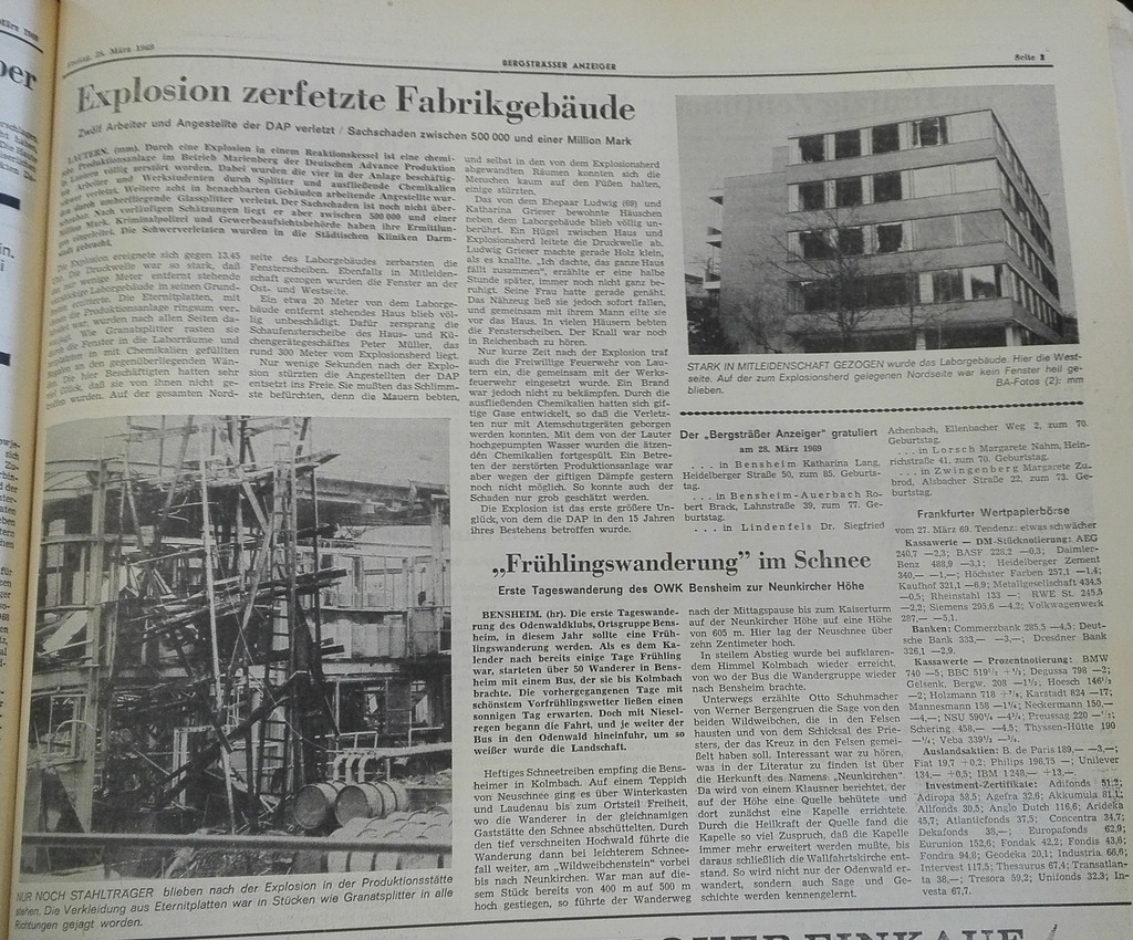 An seinem vorletzten Tag als Werkstudent wurde der Lauterner Hans Fuchs im Alter von 22 Jahren zum Rentner: am frühen Nachmittag des 27. März 1969 explodierte in der DAP in Lautern ein Kessel. Bei der Herstellung eines Additives zur Kunststoffstabilisierung erfolgte eine exotherme Spontanreaktion mit extremer Gewalt. Ob der Kessel mit falscher Rezeptur bestückt worden war oder ein anderer Fehler vorlag, konnte die Kriminalpolizei nicht ermitteln.
