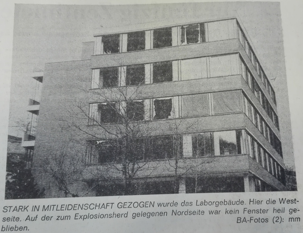 Der Kessel ragte über die Decke des 1. Geschosses hinaus, darüber war eine Stahlbetondecke. Motor und Getriebe der Anlage wurden bei der Explosion durch diese Stahldecke getrieben, der Deckel, Durchmesser 3,5m mit 36 Verschraubungen, flog weg. Der Explosionsdruck riß die Verschraubungen auf der gegenüberliegenden Seite ab, so daß die vier Personen nicht die Hauptdruckwelle abbekamen. Diese drückte die Fenster des Laborgebäudes nach innen und auf der anderen Seite nach außen, so daß die Nibelungenstraße übersät war von Glassplittern. Auch die Schaufensterscheibe des über 200 Meter entfernt liegenden Frisörgeschäfts ging zu Bruch. Das Mannloch (der mit 36 Schrauben verschlossene Deckel) flog angeblich bis in den Wald hinter der Ciba Bibliothek.