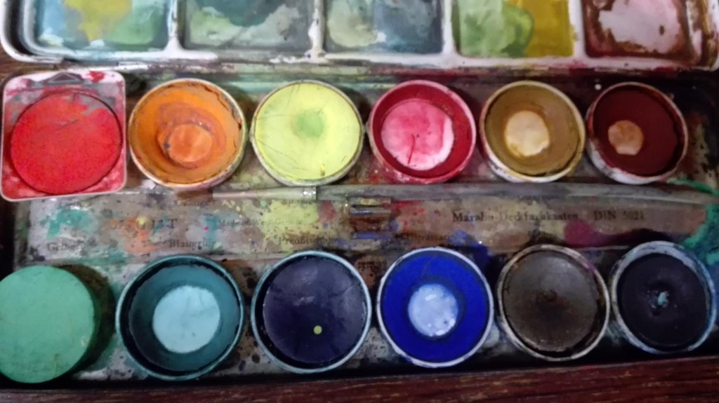 Mein alter Schulfarbkasten, der deutlich zeigt welches meine Lieblingsfarben sind...
