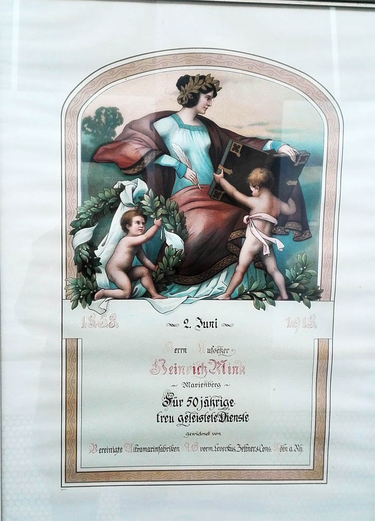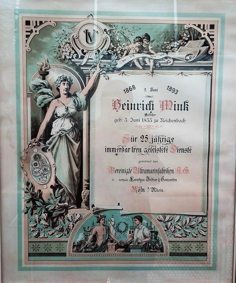 Aufseher Heinrich Mink (II), geboren am 5.6.1853 zu Reichenbach. Im Rathaus Reichenbach hängen diese beiden Urkunden der Vereinigten Ultramarinfabriken KG, vormals Leverkus, Zeltner & Consorten Köln am Rhein: