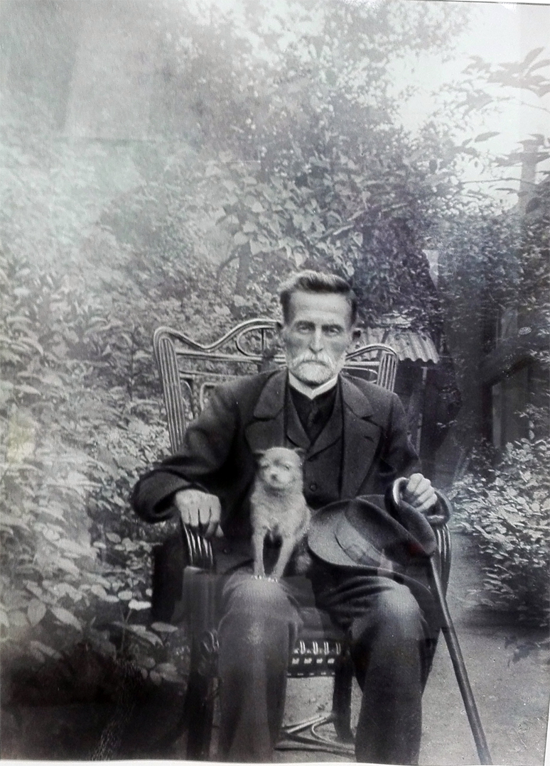 Packmeister Heinrich Mink VII, genannt "der Lange" (mit 1,94 m Größe) geboren um 1879, gestorben 1945 - das große Foto hängt in der Rathaus-Ausstellung, auf seiner Rückseite klebt der Stammbaum sowie ein Zettel "Privatbesitz von Christa Nickel, ihrerseits die 4. Generation der Familie.