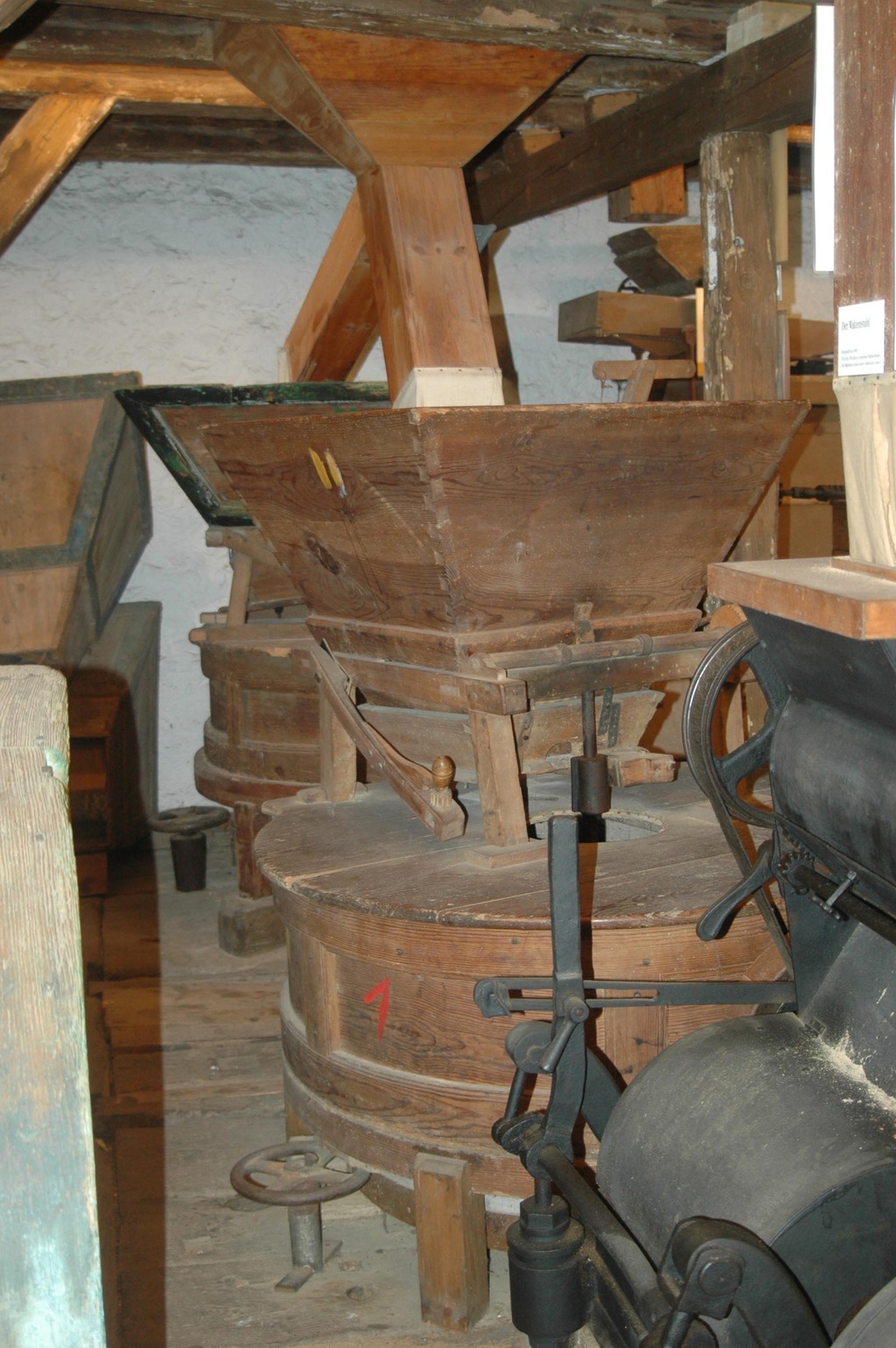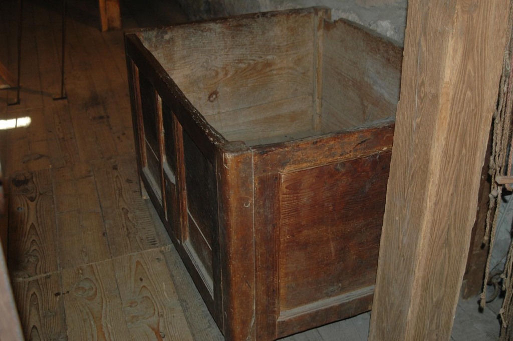 Der Mehlkasten: hier lagerte der Müller seinen Naturallohn, die Molter. Es war genau ein 16tel des Mahlgutes, also 6,25%. Doch die Bauern mißtrauten dem Müller...