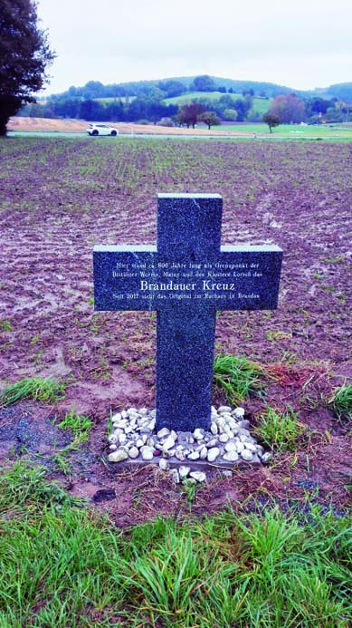 Mit dem Umzug des originalen Bäcker-Schneider-Kreuzes und der Aufstellung eines neuen Kreuzes am Weg in der Flur „am Kreuz“ auf dem Geisberg waren sowohl die Denkmalschutzbehörde als auch die Brandauer, die im Oktober am Grenzgang teilgenommen hatten, einverstanden. Das neue Kreuz steht parallel zum Weg und ist zusätzlich durch gut sichtbare hohe Pfosten markiert, die der Fahrer der Erntemaschine auch im hohen Mais gut erkennen kann.