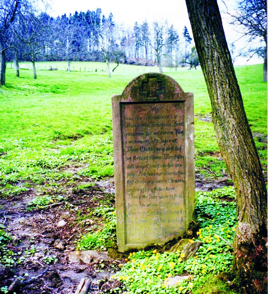„Im Jahr 1846 den 22. Oktober ist die Margaretha Bitsch von Breitenwie-sen hier auf diesem Platze verbrennt. Ist 3 Jahre alt. Mein Gott ich weiß wohl, daß ich sterbe, ich bin ein Mensch der bald vergeht, und finde hier kein solches Erbe, das unveränderlich besteht. Drum zeige mir in Gnaden an, wie ich seelig sterben kann. Mein liebster Vater wann ich sterbe so nimm du meinen Geist zu dir. Dann bin ich ja dein Kind und Erbe und hab ich Jesu nur bei mir, so gib mir gleich und ... mir, wo..."