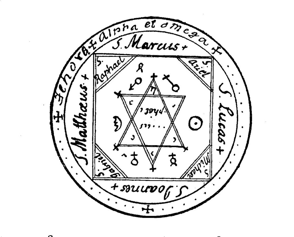 „Und also befehle ich euch ihr Erdengeister, Pigmeas, Nymphen und Silven, anstatt Gottes des Allmächtigen Vaters, Ehi, Aser, Elion, Jehova, Adonai, Tetagrammaton, Esaera, daß Ihr diesen Schatz in die Höhe hebet aus der Erden"