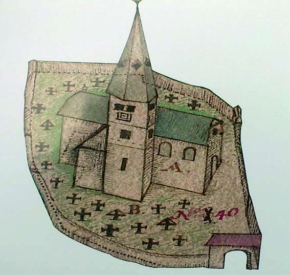 Die alte Kath. Kirche St. Andreas stand genau dort, wo heute die Ev. Kirche steht. Sie hatte einen zentralen Turm und stand mitten im Gräberfeld. Das Kirchenschiff war ziemlich genau in Richtung der uralten Quarzader "Reichenbacher Gold" ausgerichtet - lesen Sie dazu auch Das Reichenbacher Gold und Die Grimmkarte von 1763 mit Legende und Johann Wilhelm Grimm: unbekannte Grabstätte