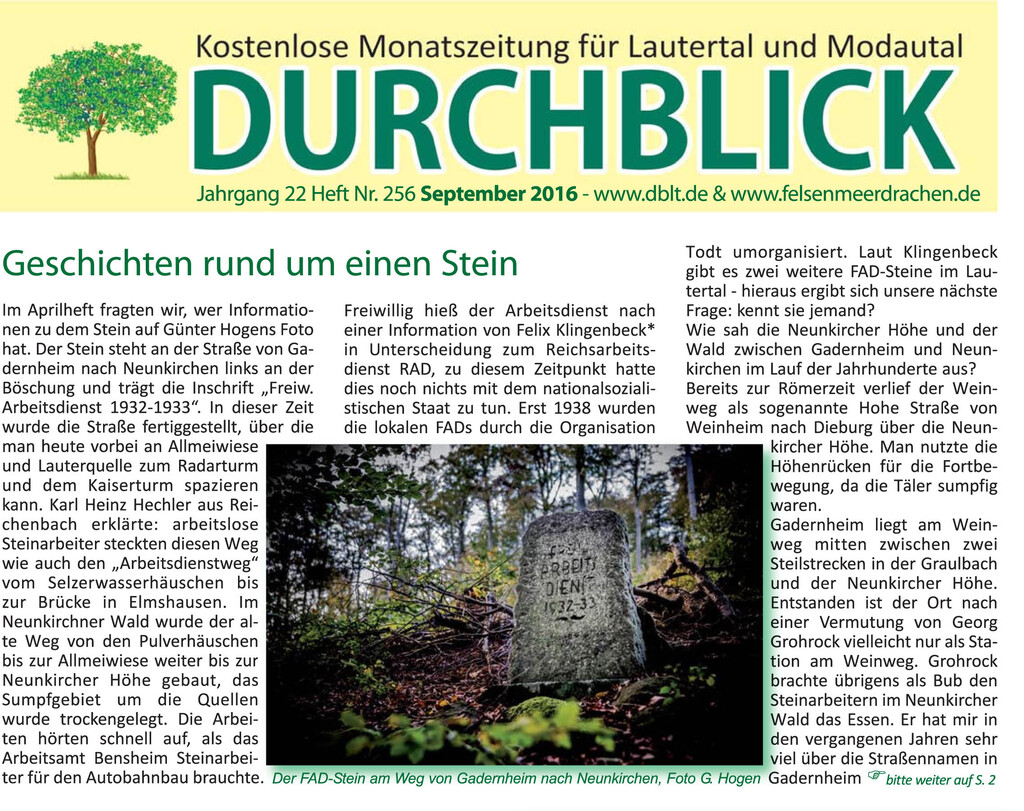 Das große Interesse am Stein des freiwilligen Arbeitsdienstes (FAD), der in einer unserer Heftausgaben vorgestellt wurde zeigt, dass Regionalgeschichte nach wie vor viele Menschen beschäftigt und fasziniert.