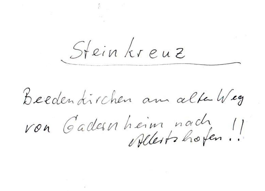 Man läuft von der "Schweiz" in Gadernheim (niemand weiß genau, warum die Straße "Schweiz" heißt) geradewegs zwischen Lautern, Beedenkirchen und Brandau über die "Braad Haad", die breite Heide, vorbei am Bäcker-Schneider-Kreuz, einem Sühnekreuz das sicherlich nicht ohne Grund an diesem alten Weg liegt, und durch den Wald am Hasenberg nach Allertshofen centre ville. Ich danke Frau Jutta Kaffenberger für ihre Zuschrift, aus der ich erstmals von diesem alten Weg erfahren habe. Marieta Hiller, Mai 2018