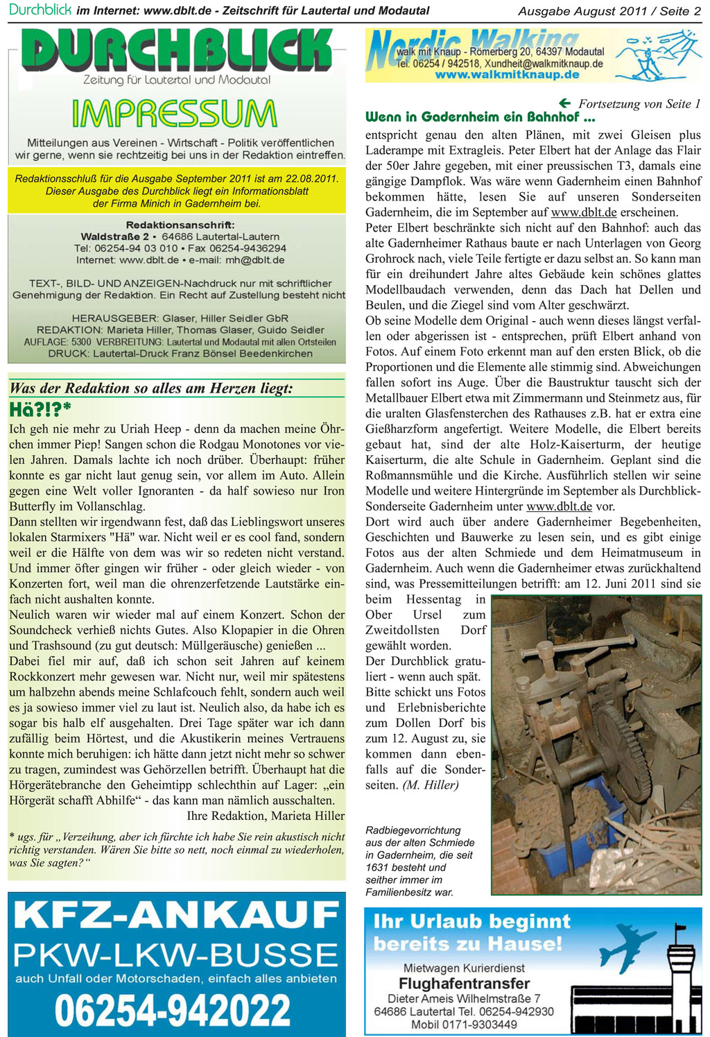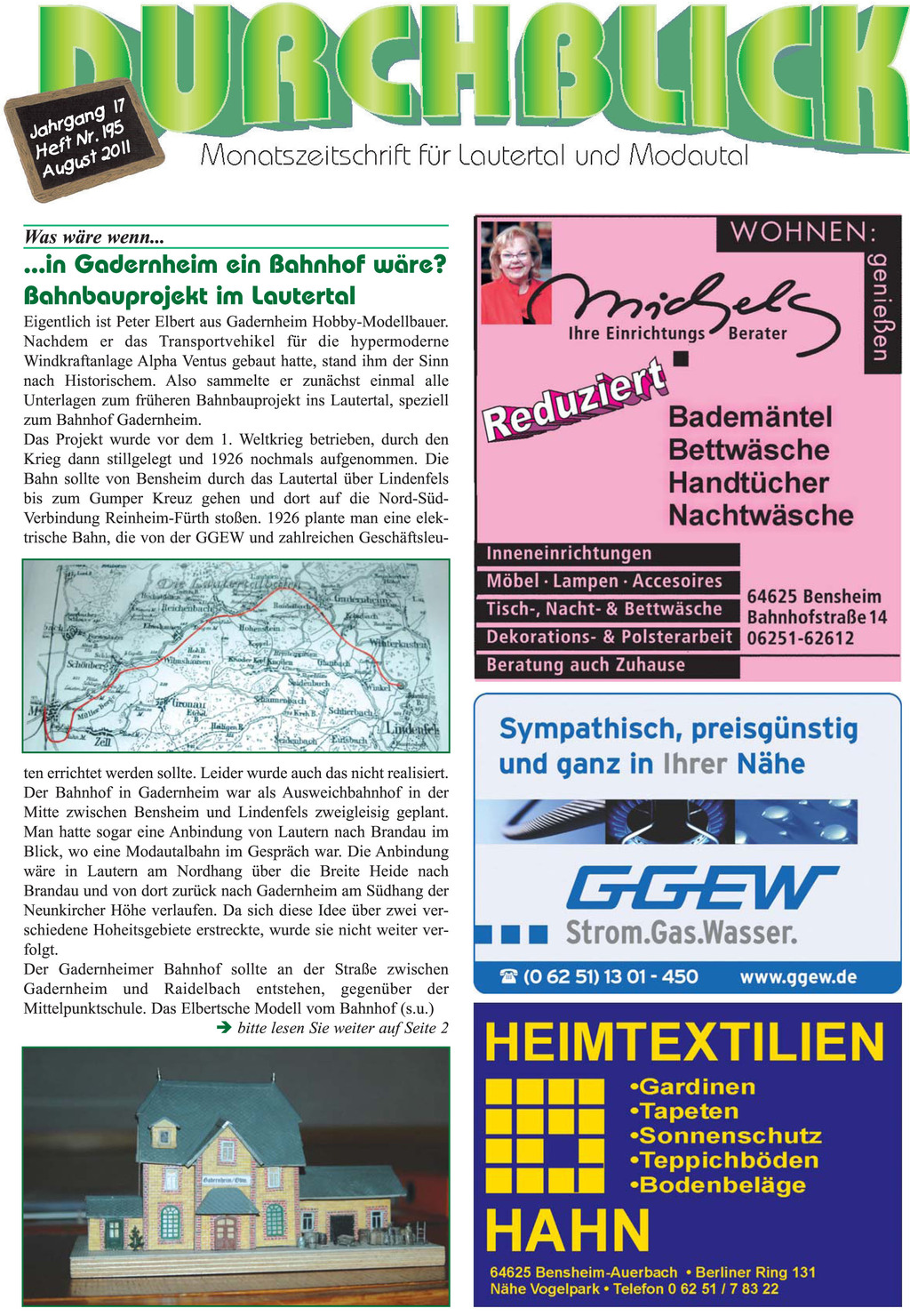 Der Gadernheimer Modellbauer Peter Elbert sammelte alle Unterlagen zum früheren Bahnbauprojekt Lautertal, um den Bahnhof Gadernheim nachbauen zu können. Was er noch alles gebaut hat und auch was Gadernheim tatsächlich zu bieten hat, nicht nur virtuell, finden Sie im Anhang "Sonderseiten Gadernheim 2011".