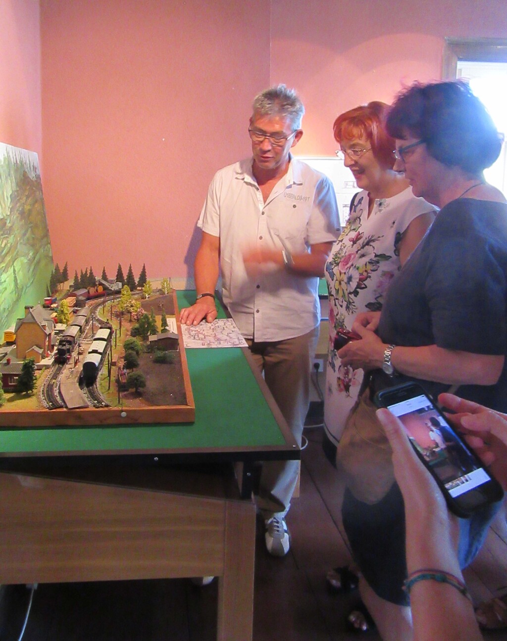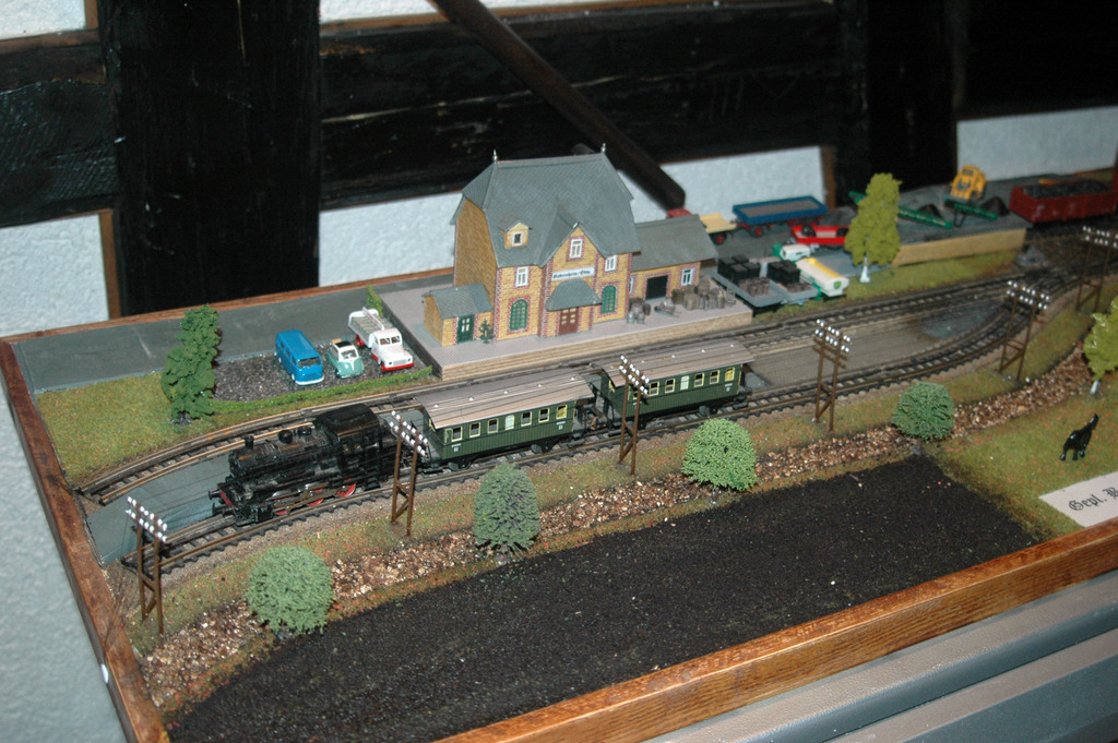 Der zweigleisig geplante Bahnhof Gadernheim, mit Accessoires im Stil der 50er Jahre, sollte nach Plänen von Peter Elbert an der Straße zwischen Gadernheim und Raidelbach gegenüber der Mittelpunktschule gebaut werden. Er sollte eine Laderampe für die Steintransporte erhalten. Auf dem Foto sieht man eine preussische T3.