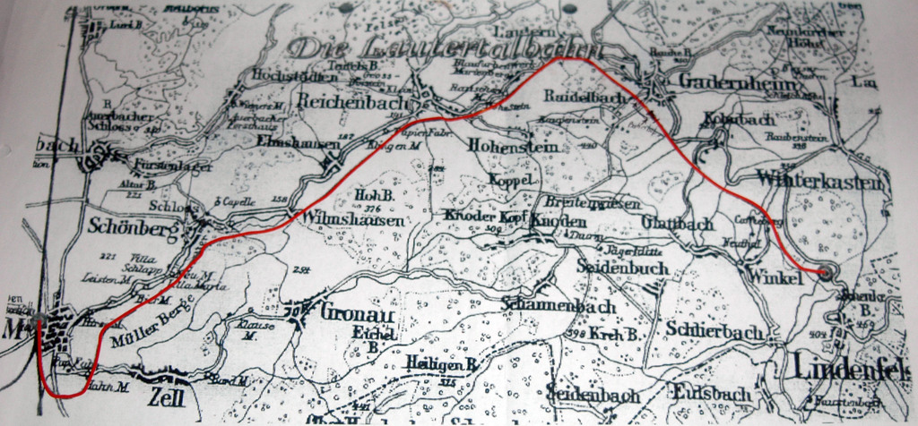 Nun begann man sich über die Streckenführung zu streiten. kürzer und billiger wäre diese über Schönberg (Cont. EG Berlin). Ritter von Marx und Herr von Balkenstein eerhoben einspruch, die Linie sollte über Zell und durch einen Tunnel durch den Schönberger Wald führen. Die Mehrkosten wollte jedoch keiner der Herren aufbringen.