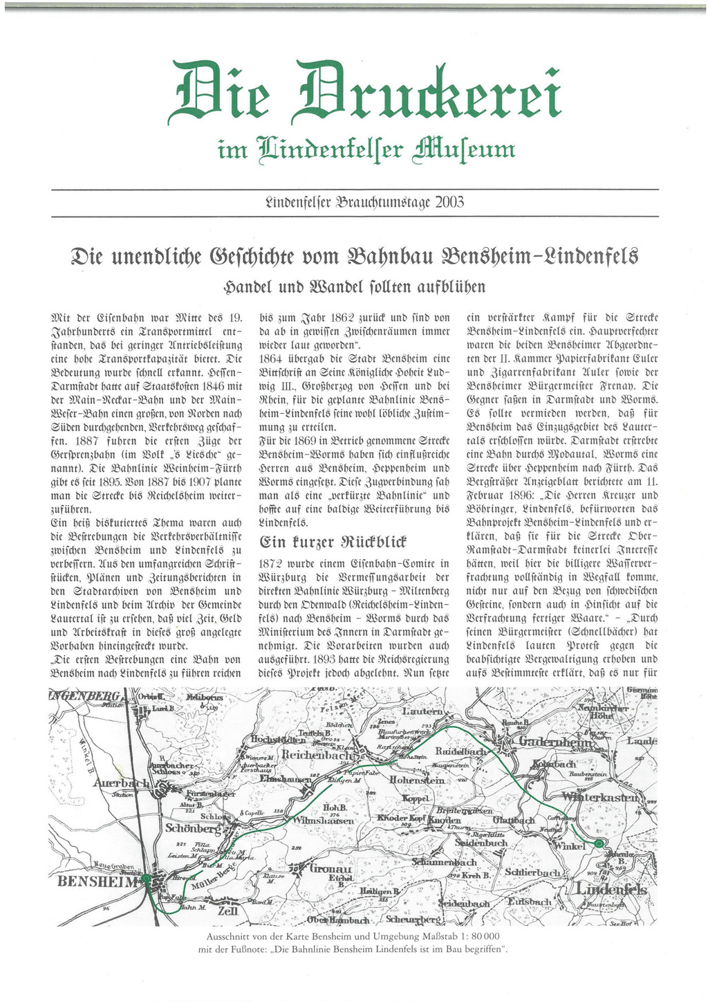 Ich bin sicher, daß ich diese Ausgabe irgendwo in meinem Bücherschatz habe, aber ich finde sie nicht. Erinnert hat mich ein netter alter Herr aus Pfungstadt, der mich immer mit neuen Infos und Details versorgt. Vom Kur- und Touristikservice Lindenfels habe ich dankenswerterweise die vier Seiten der Lindenfelser Museumsdruckerei anläßlich der Brauchtumstage 2003 nun wieder erhalten.