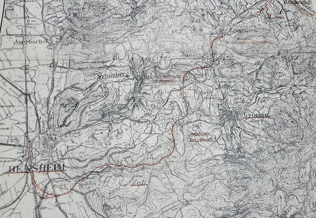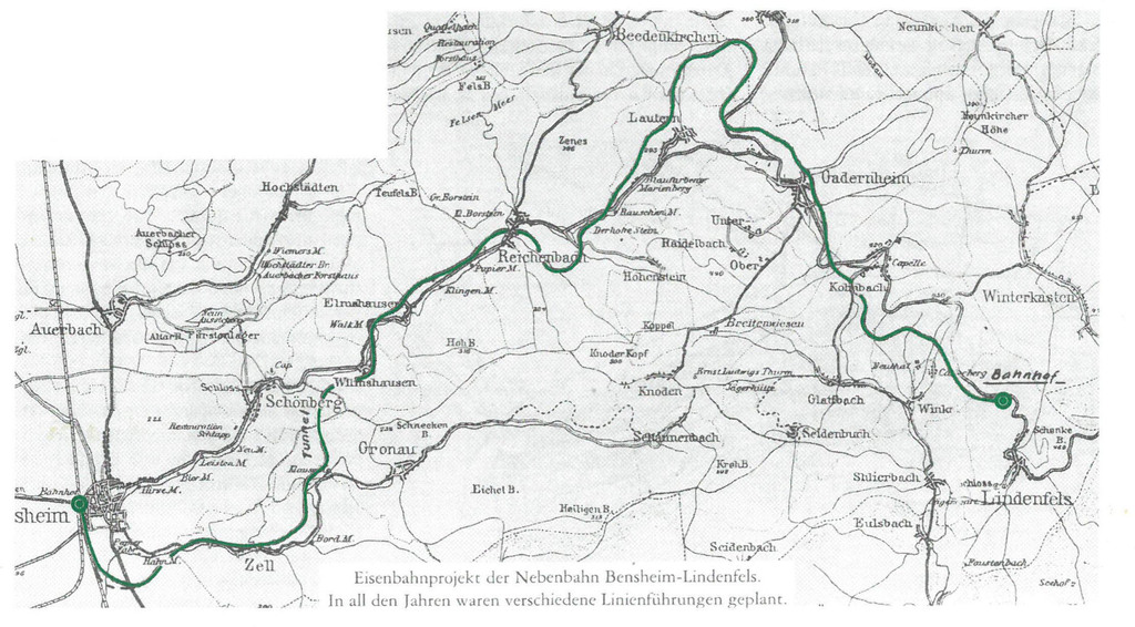 Einer der geplanten Streckenverläufe: Bensheim über Hahnmühle auf die Höhe der Müllerberge oberhalb der Hirsemühle, Biermühle, Leistenmühle und Neumühle südlich von Schönberg nach Wilmshausen und weiter oberhalb Klingenmühle und Papierfabrik in Elmshausen südlich an Reichenbach vorbei durch das Destag-Gelände unterhalb des Hohensteins, oberhalb Rauschenmühle und Blaufarbenfabrik Marienberg (mitten durch die Deponie), in Lautern dann in einer weiten Kurve nach Südosten abknickend, die Strecke wäre direkt unterhalb meines jetzigen Wohnhauses in der Waldstraße verlaufen. Weiter südwestlich von Gadernheim zur scharfen Altstraßenschleife oberhalb Gadernheim (Ein Tunnel bei Kolmbach im Beitrag Modautalbahn im Jahrbuch 2021), weiter ziemlich schnurgerade bis zur Kurve, wo heute die Busse von Auto-Schmidt Lindenfels stehen. Bei dieser Bahnführung ging es nicht darum, Touristenströme nach Lindenfels zu bringen, sondern die Steinbetriebe (hier Kreuzer & Böhringer) brauchten eine günstige Verkehrsanbindung zum Rhein. Daher endete der Plan in Höhe des Betriebsgeländes der Steinschleiferei.