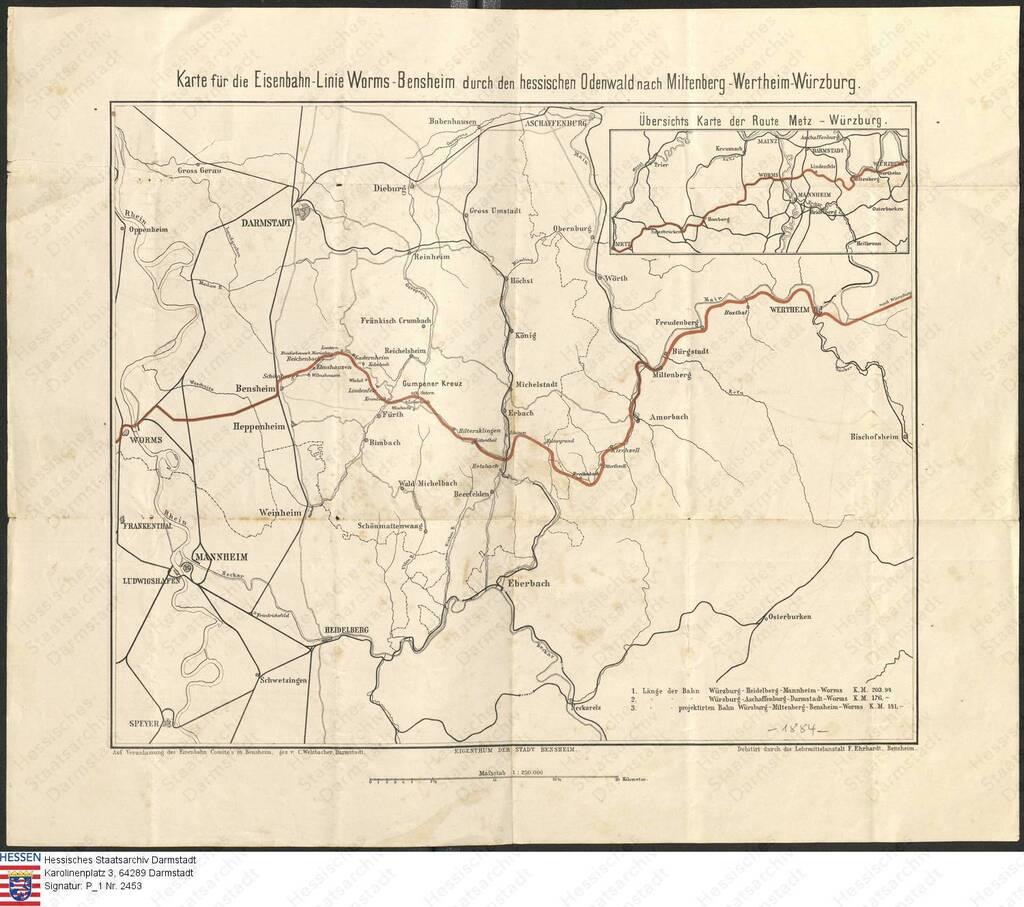 Tatsächlich war dieser Streckenabschnitt aber nur ein Teil eines viel größeren Projektes: eine geplante Eisenbahnlinie von Worms bis Würzburg sollte durch das Lautertal führen, wie die "Karte für die Eisenbahnlinie Worms-Bensheim durch den hessischen Odenwald nach Miltenberg-Wertheim-Würzburg mit Nebenkarte ‚Übersichts Karte der Route Metz-Würzburg‘ größeren Maßstabs" aus dem Jahr 1884 zeigt. Gezeichnet wurde die Karte auf "Veranlassung des Eisenbahn Comite‘s in Bensheim, gez. v. C. Welzbacher, Darmstadt, Debitirt durch die Lehrmittelanstalt F. Ehrhardt, Bensheim", zu finden im Hessischen Staatsarchiv Bestand P1 Nr. 2453.