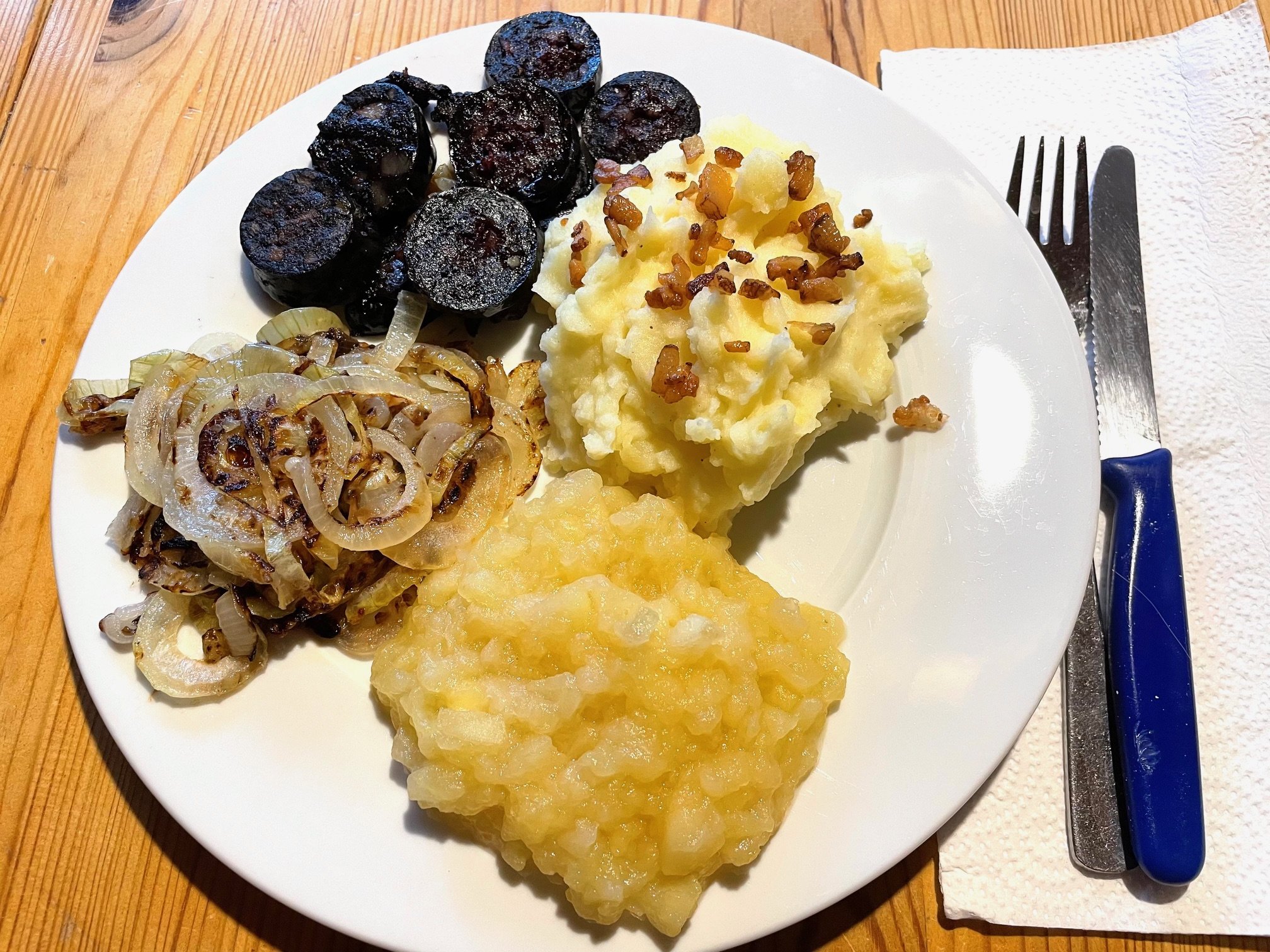 Aus Ernsthofen antwortete eine Dame, die im Rheinland groß geworden ist. "Dort war es ein beliebtes Herbstessen, besonders in der Kriegs- und Nachkriegszeit. Nicht immer gab es "Bloodworsch" dazu, sondern nur gebratene Zwiebel, oder ein Spiegelei. Ausserdem wurden gestampfte Kartoffel und gut verkochte Äpfel zusammengerührt, oder auch zusammen gekocht. Aber bei aller Sparsamkeit in der damaligen Zeit sagte meine Mutter: es muss unbedingt ein Stich Butter daran. Diesen Rat befolge ich bis heute, denn der Stich Butter am Gemüse ist das I-Tüpfelchen des Geschmacks." M. Hiller