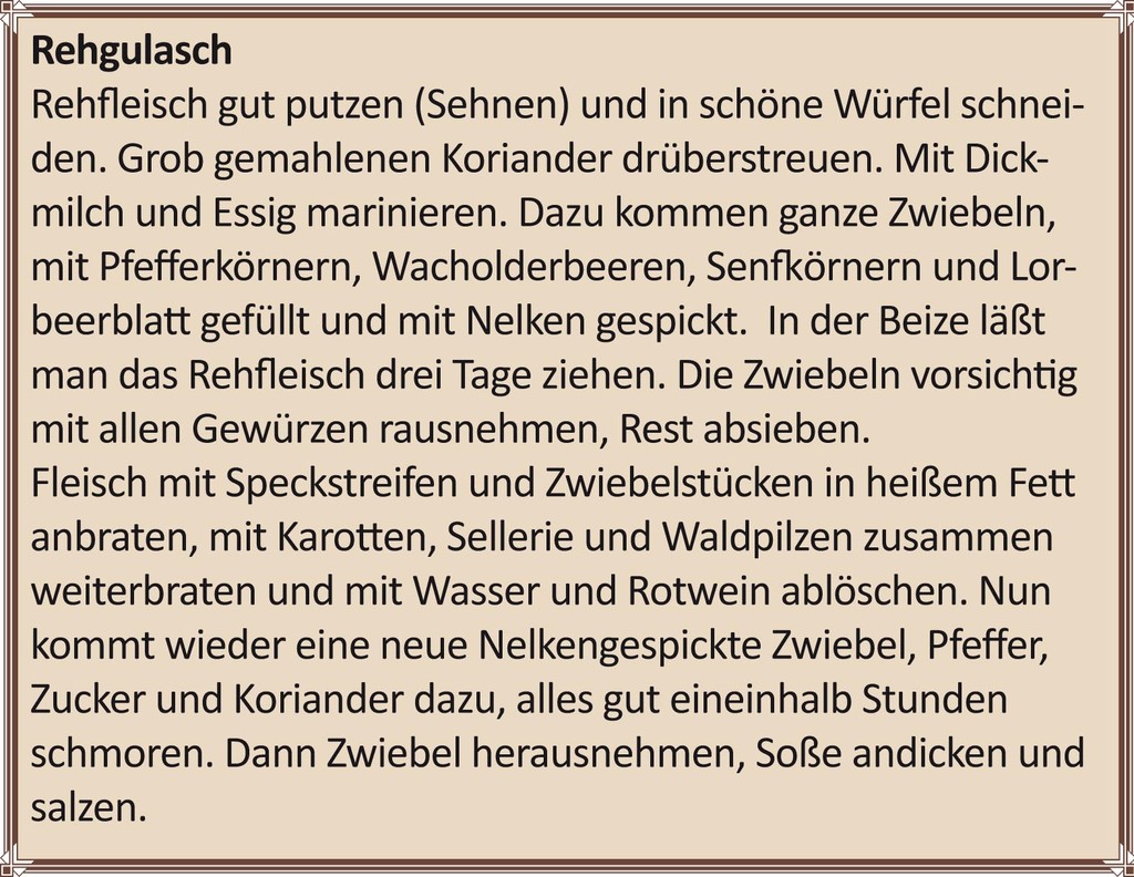 Wild war eine Speise der Reichen, die sich eine Jagd pachten konnten, oder für die ganz Armen, die aus Not oder durch das Verbotene gereizt, mit Schlingen und Netzen Hasen und Rehe erbeuteten.