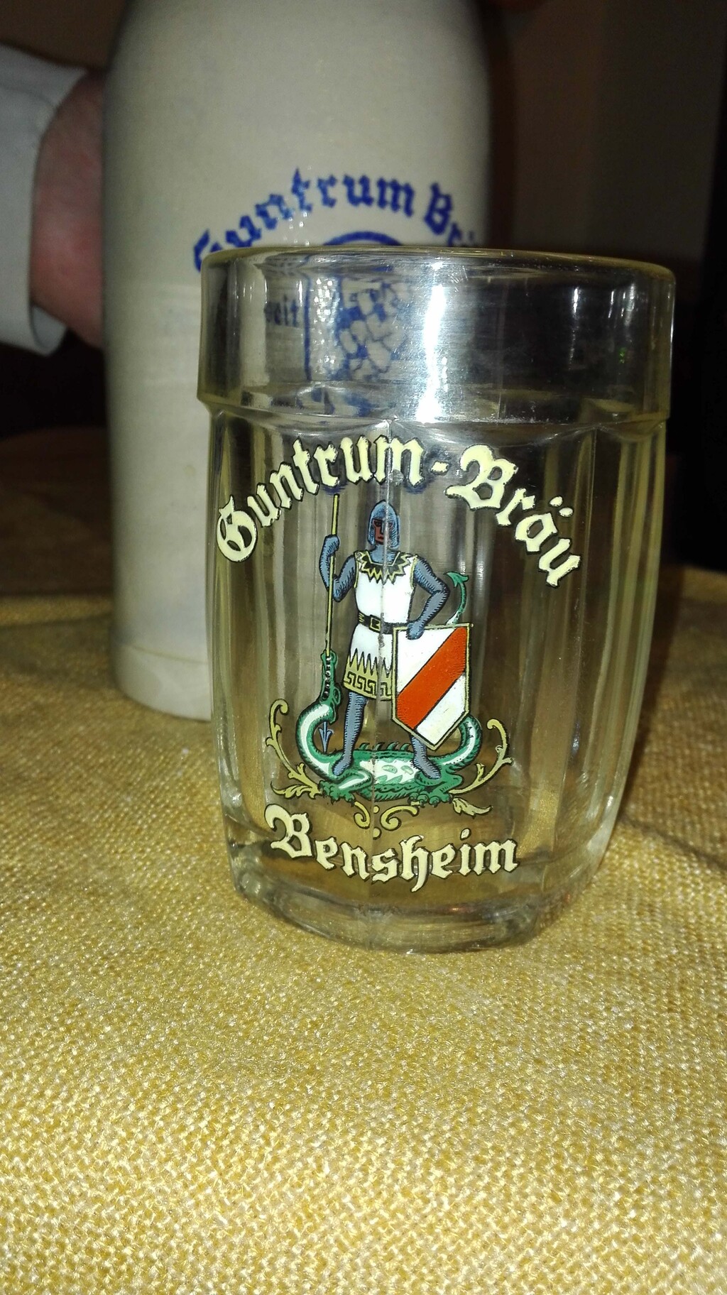 Auf diesem Glashumpen der Brauerei Guntrum ist noch das alte Logo mit dem Drachentöter Georg zu sehen, übrigens handgemalt!