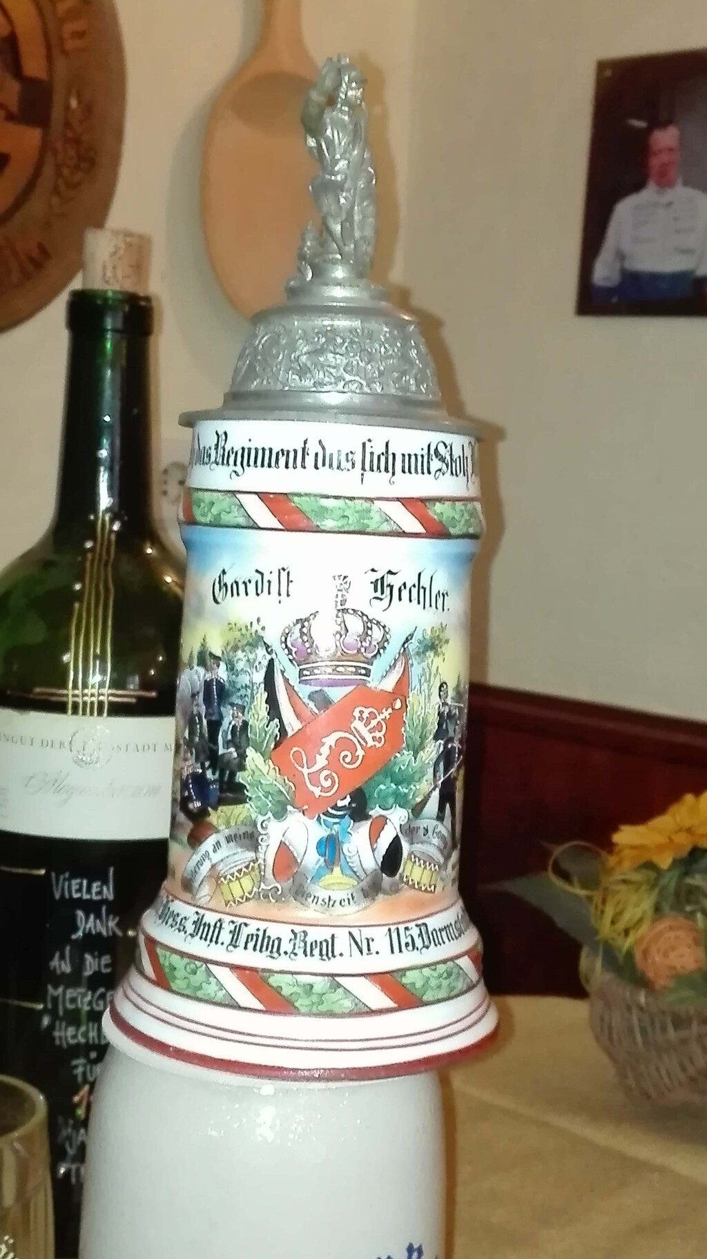Der Regimentskrug von Urgroßvater Philipp Hechler, Großherzoglich Hessisches Infanterie Leibgarde Regiment Nr. 115 Darmstadt. Besonderheit: der Boden des Kruges ist aus unterschiedlich dickem Material, so daß das Licht durchscheint und man zwei Figuren erkennen kann, die sich küssen