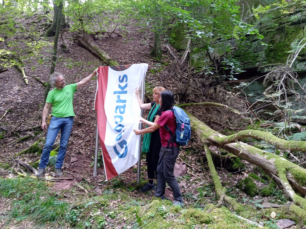 Eine Steinbruchlandschaft im Buntsandstein bei Miltenberg wurde im September als Geotop des Jahres 2023 vorgestellt. An der Haagsaussicht weit oberhalb Miltenbergs und der Mainschleife, auf der Abraumhalde des früheren Steinbruchs im Plattensandstein, wurde gemeinsam mit Bürgermeister Bernd Kahlert und stellvertretender Landrätin Monika Wolf-Pleßmann durch Dr. Jutta Weber (Geschäftsführerin des UNESCO Global Geoparks Bergstraße-Odenwald eine neue Tafel enthüllt. Zu Gast waren zwei Ranger des Partner-Geoparks in Hong Kong (Hong Kong UNESCO Global Geopark), die für einige Tage durch die bedeutsamen Geotope der Region geführt wurden.