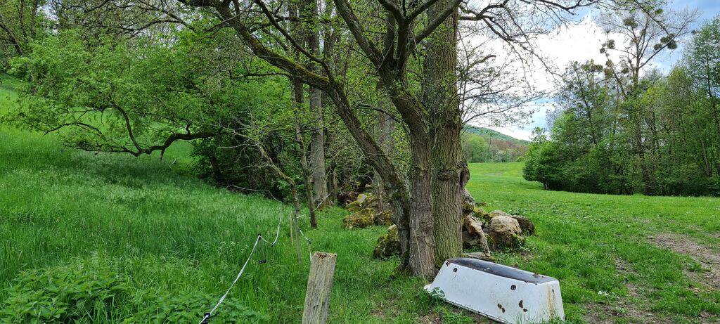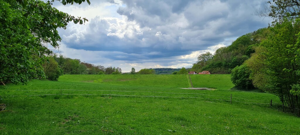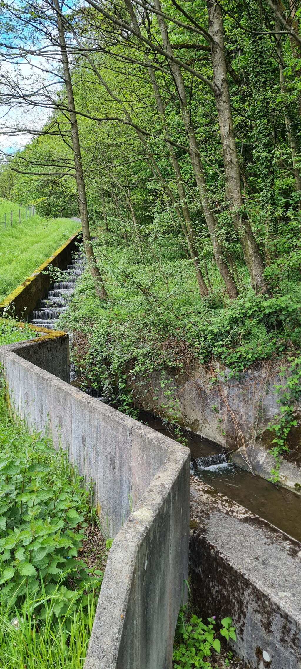 Blick nach Westen: nach den Kaskaden öffnet sich ein weites Becken - das Hochwasser-Rückhaltebecken oberhalb Reichenbachs. Es ist so konzipiert, daß das anstauende Wasser nicht bis auf Höhe der Deponie reichen kann. Die Deponie ist zwar von oben verkapselt, jedoch könnte durch das Grundwasser Deponiematerial ausgeschwemmt werden. Ein Kontakt zwischen der Grundwasserzone der Deponie und dem anstauenden Hochwasser im Becken muß daher ausgeschlossen werden.